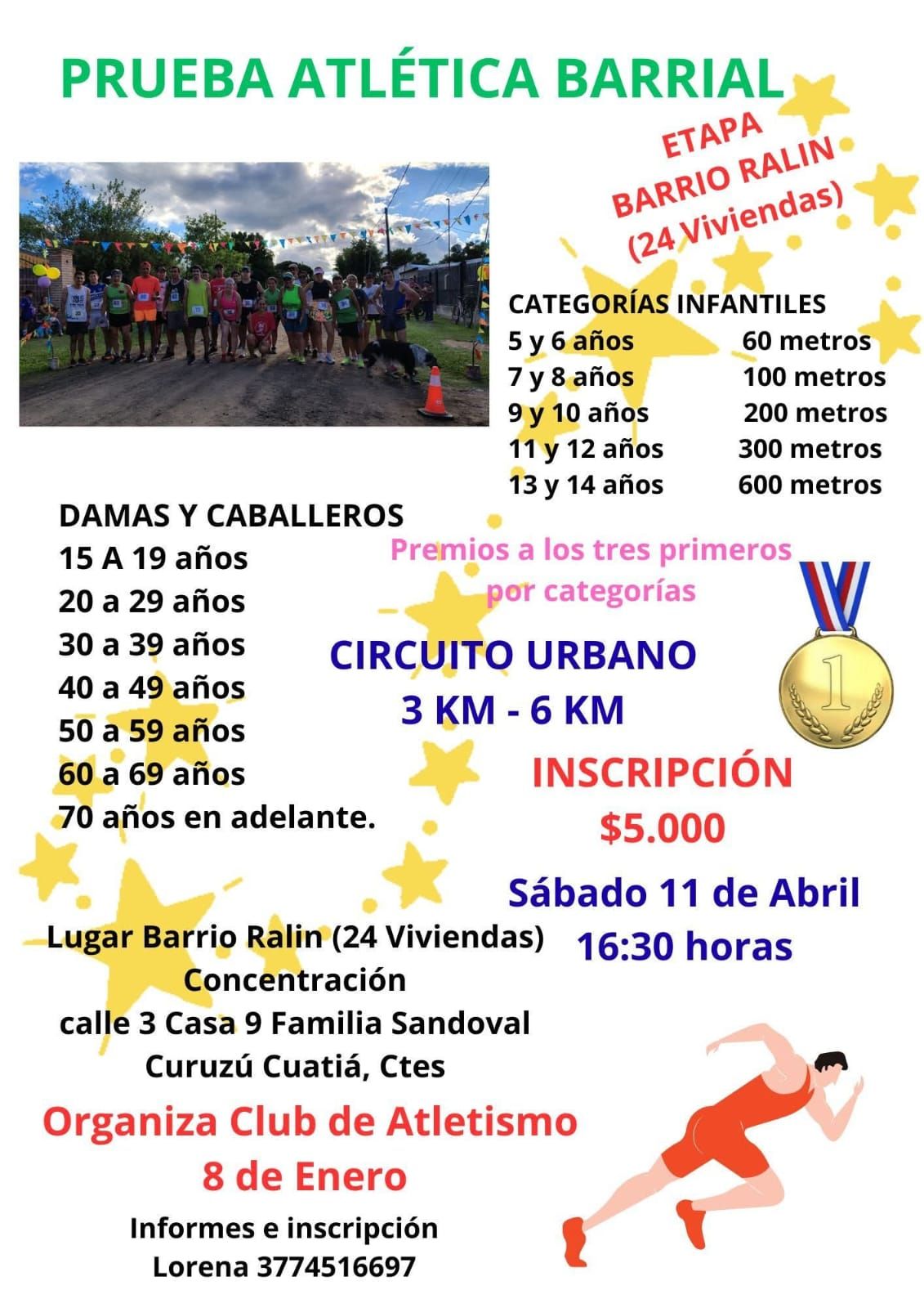 Se viene la Segunda Etapa de la Prueba Atlética Barrial “Edición Barrio Ralin (24 Viviendas)”, la misma será el sábado 11 de abril a partir de las 16:30 horas, con la organización de los atletas Lorena Alvez y José Alegre del Club de Atletismo 8 de Enero de Curuzú Cuatiá.