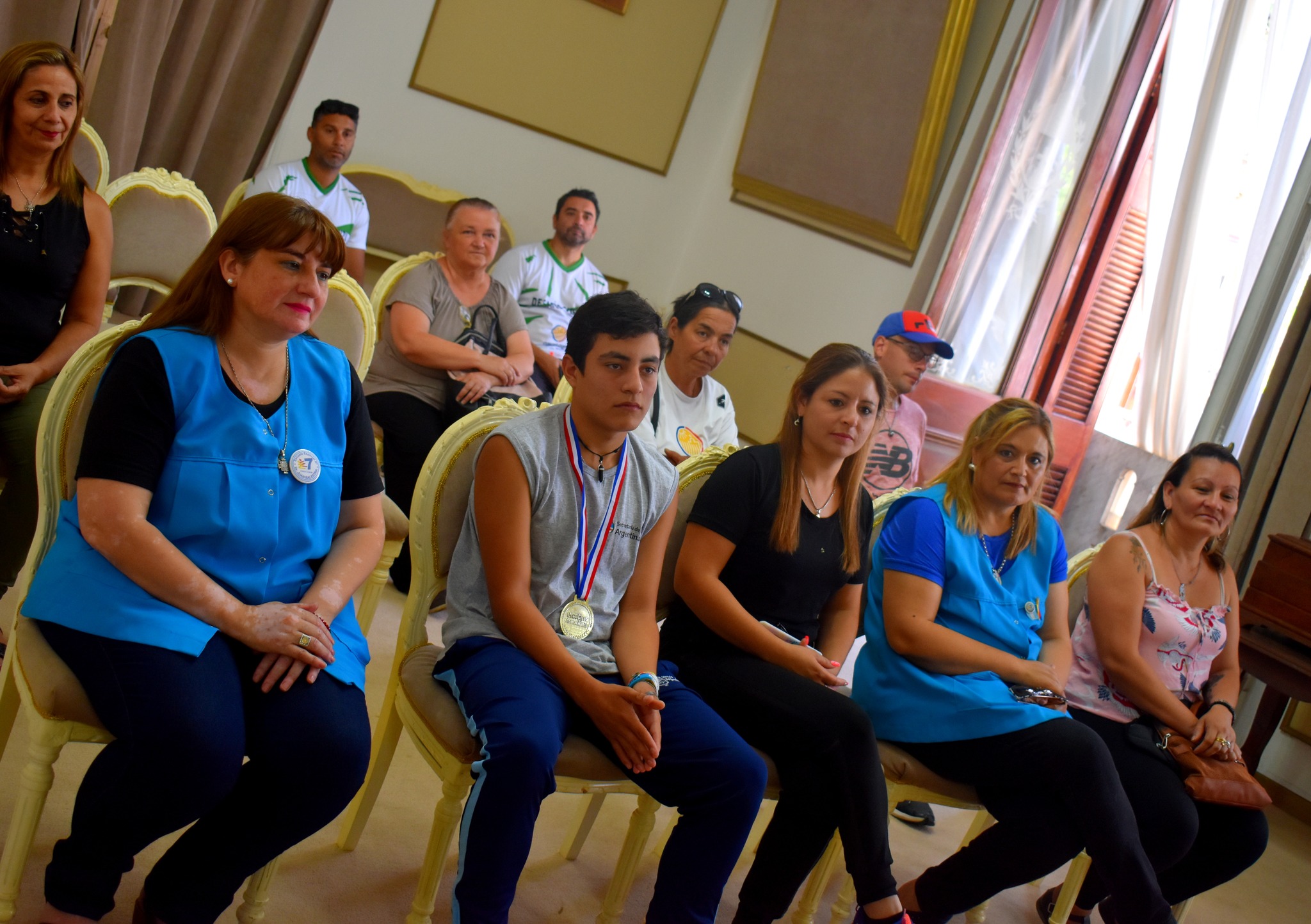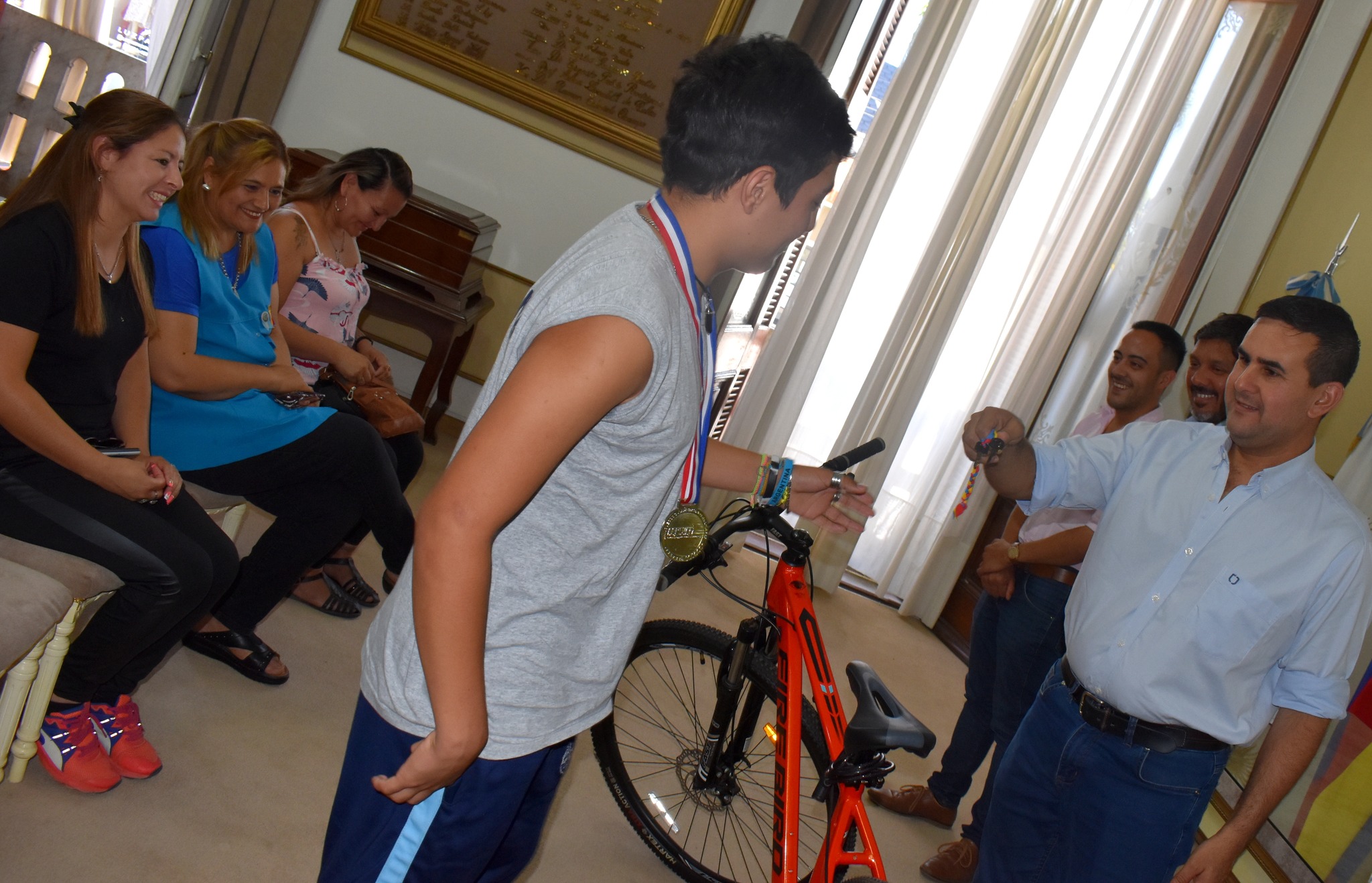 El intendente municipal José Irigoyen, junto a un grupo de funcionarios de su Gabinete Ejecutivo, recibieron esta mañana al atleta Vladimir Sotelo, alumno de la Escuela Especial N°7 "Juan Balestra", quien llegó al Palacio Municipal acompañado por directivos, profesores y familiares para ser recibidos por el Intendente en el Salón Dorado.