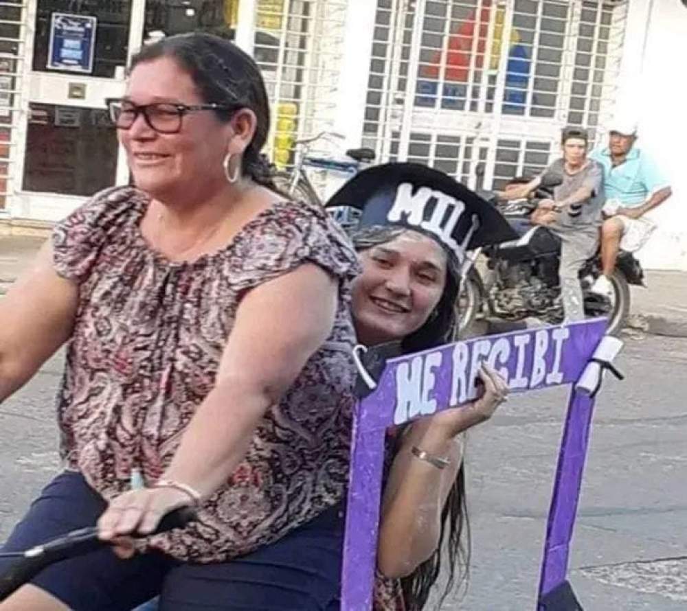 Milagros contó cómo se gestó el particular desfile: "un día mi mamá me dijo que como teníamos solo una bici, cuando me reciba me iba a llevar de caravana. ‘Yo tengo mi moto ahí afuera’, me decía siempre, haciendo referencia a la bici, y siempre cuando se acercaba la fecha de rendir me decía ella ‘mira que tengo preparada la moto eh’, pero yo tenía un poco de miedo por su salud, porque sufre de dolores de espalda".