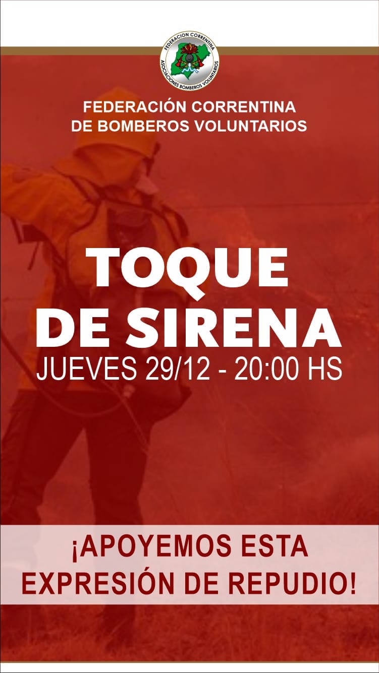 Ante esta situación, el Consejo Nacional de Bomberos Voluntarios de la República Argentina convocó al toque de sirenas en todos los cuarteles del país, medida que fue adherida por la Sociedad Cuerpo de Bomberos Voluntarios de Curuzu Cuatiá, razón por la cual a las ocho de la noche en punto sonaron las sirenas en el cuartel de calle Irastorza.