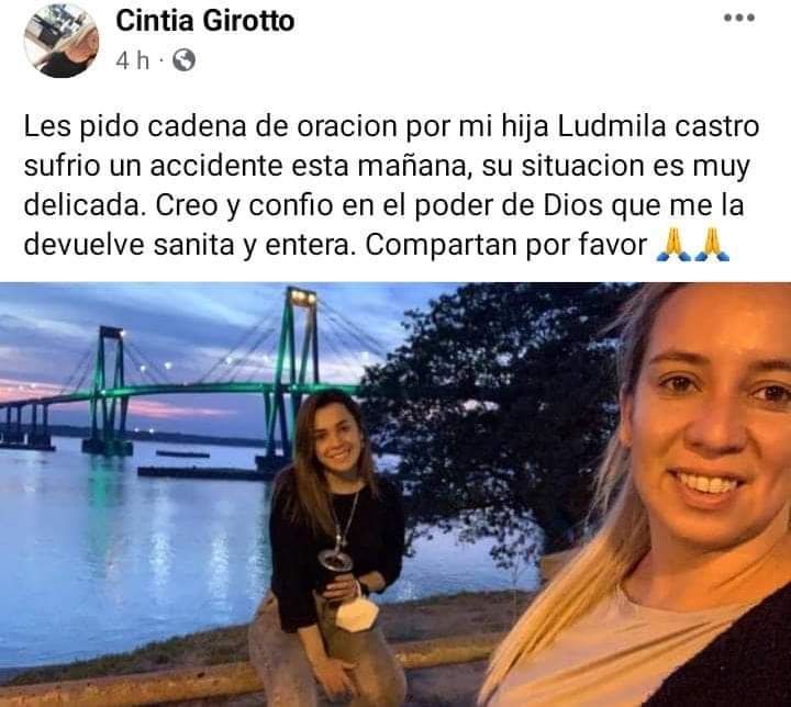 Un siniestro ocurrido en la Ruta Nacional 12, en cercanías de Empedrado, dejó en muy grave estado a una joven de Curuzú Cuatiá y su familia pidió cadena de oración a través de las redes sociales.