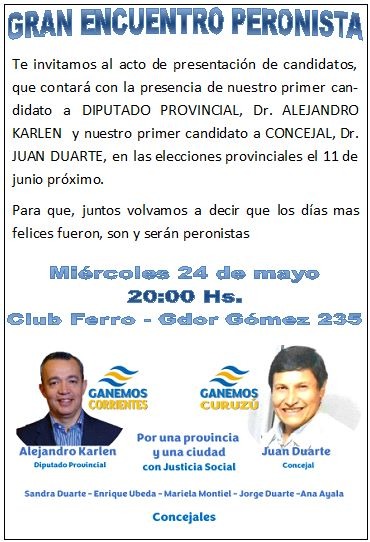 El acto será en el Club Ferro, por calle Gobernador Gómez al 200, el miércoles 24 de mayo a partir de las 20 horas, ocasión en que se contará con la presencia del candidato a Diputado Provincial Alejandro Karlen.