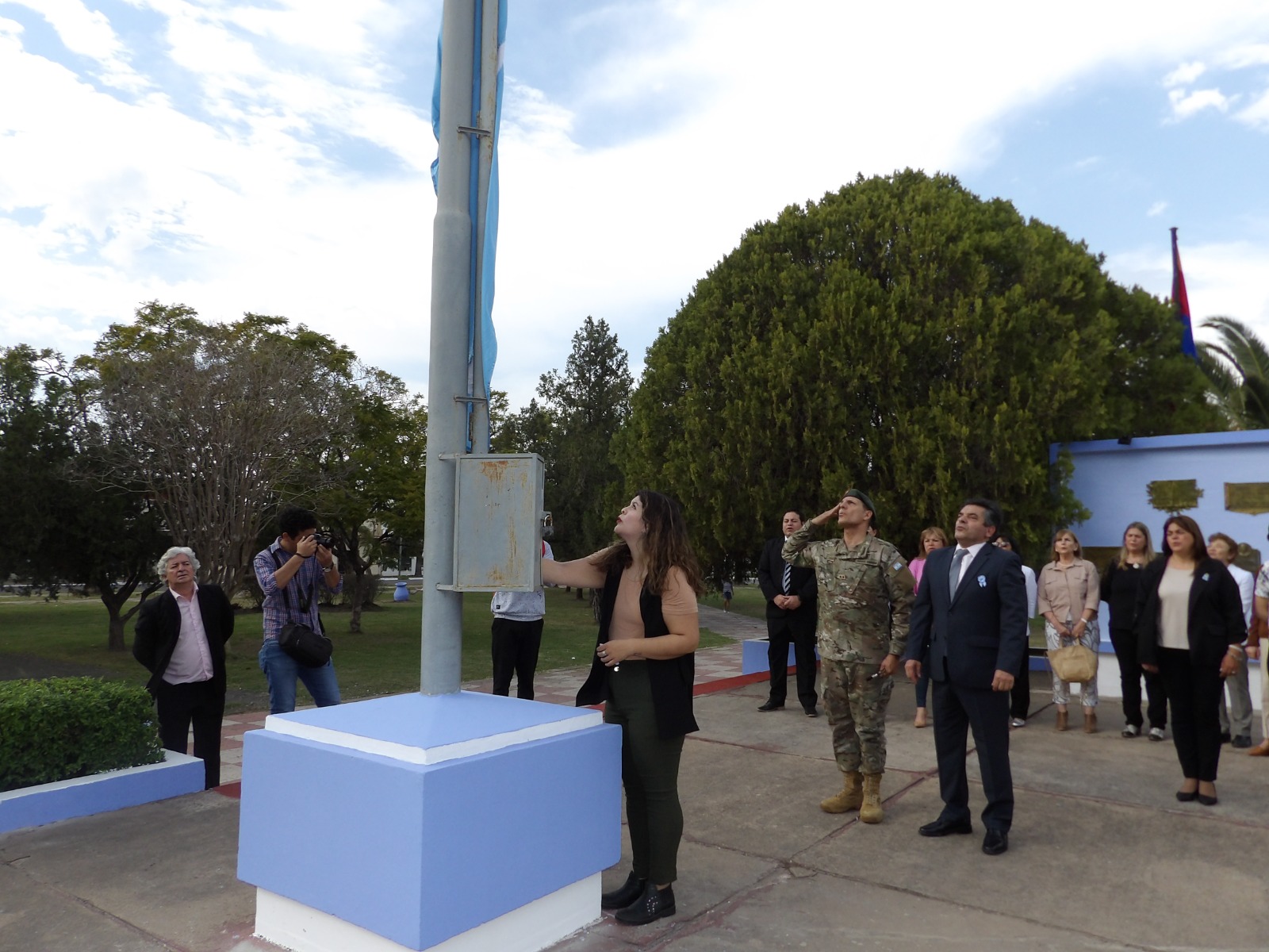 Posteriormente las autoridades se trasladaron hasta la Plaza General San Martín en donde también se izó la Enseña Patria por el Vice Intendente Municipal Guillermo Morandini, la vice presidente primera del Honorable Concejo Deliberante Fabiana Ruiz y el comandante de la Primera División de Ejército Aldo Ferrari.