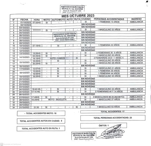 El Hospital Fernando Irastorza emitió el informe estadístico correspondiente a octubre sobre actuaciones en siniestros viales tanto en el ejido urbano como en ruta,