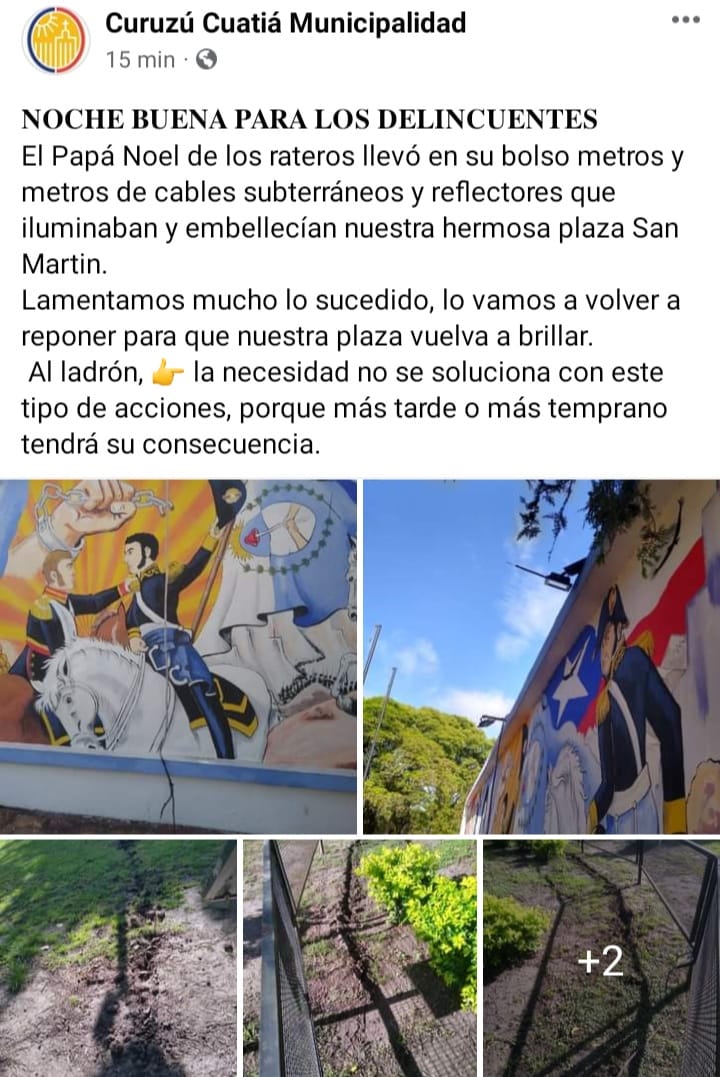 Mediante su cuenta oficial de Facebook, la Municipalidad de Curuzú Cuatiá informó que desconocidos robaron varios metros de cables subterráneos y reflectores que iluminaban el tradicional espacio público.