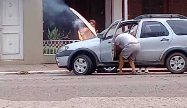 En el video se alcanza a ver claramente dos llamaradas de fuego salir de la parte de adelante del rodado que estaba con el capot levantado, las que fueron apagadas con agua de una botella que arrojaba una valiente mujer que en su otra mano tenía una bolsa, mientras que el conductor buscaba algo del interior del vehículo, quizás el matafuego.