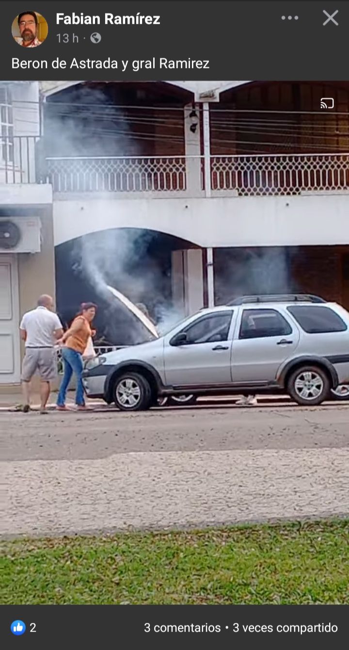 El usuario de Facebook Fabián Ramírez publicó este lunes en su cuenta un video de 22 segundos en los que se observa un principio e incendio que se originó en el motor de un auto, el hecho ocurrió sobre calle Berón de Astrada, a escasos metros de su intersección con General Ramírez.