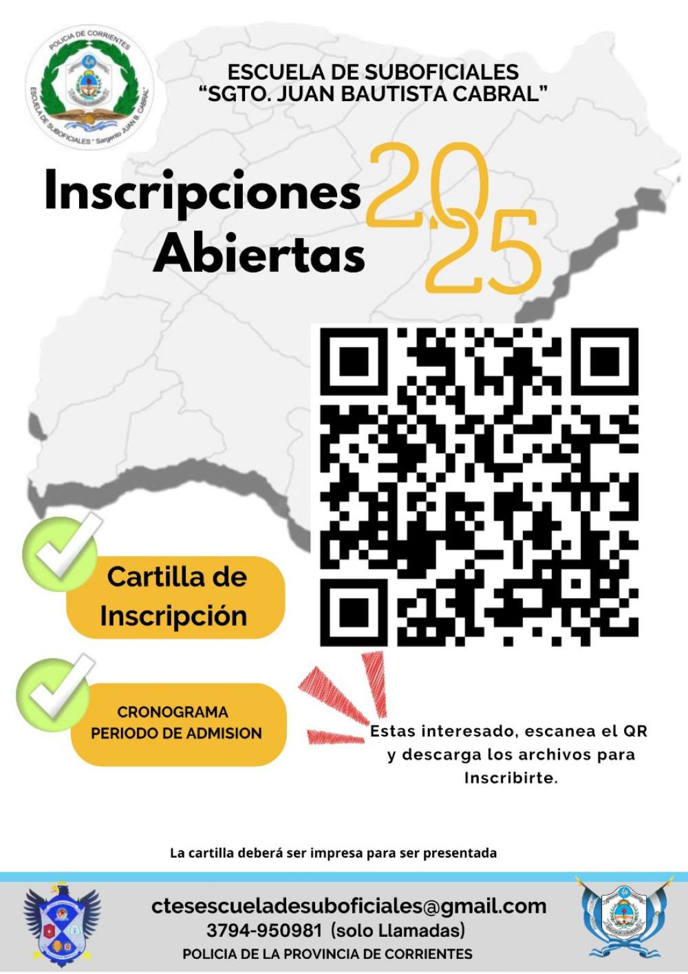 A partir del día 10 y hasta el 19 de Febrero inclusive, se halla abierta la inscripción para la VII Promoción de Aspirantes a Cabo de Policía, de la División Escuela de Suboficiales “Sgto. Juan Bautista Cabral”, de la Policía de Corrientes.