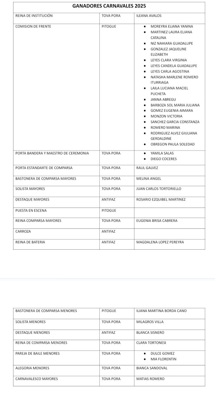 El ganador en el rubro Batería fue “La Poderosa Batería” de Pitogué, mientras que en el rubro armonía hubo un empate en el primer lugar entre Pitogué y Antifaz, mientras que la Reina del Carnaval Curuzucuateño 2025 también fue para Tovà Porà que se quedó con la mayoría de los rubros.