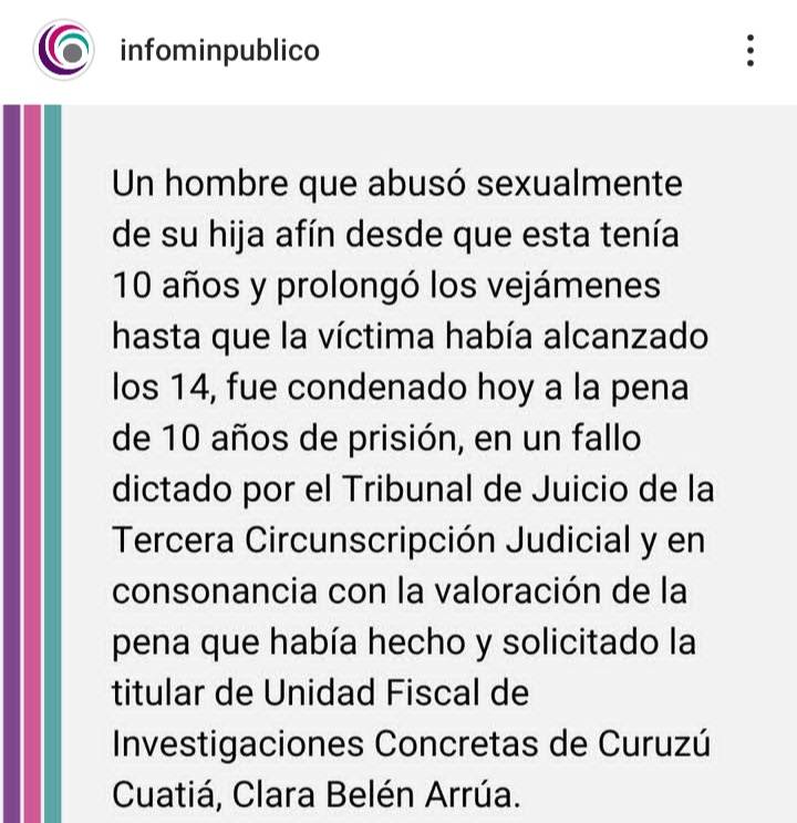 Curuzú Cuatiá; diez años de prisión por abusar sexualmente de su hija afín El Tribunal de Juicio de Mercedes valoró las pruebas presentadas por la Unidad Fiscal de Curuzú Cuatiá. La cuenta oficial del Ministerio Pùblico Fiscal brindó detalles que compartimos a continuación. facebook twitter