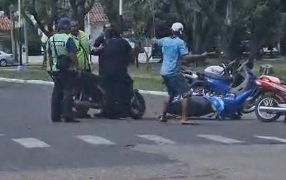 Esta imprudente acción, ya que tomó una arteria en contra mano, fue vista por un Inspector, que se acercó a estas personas y les solicito las documentaciones del rodado, respondiendo que no contaban con nada, por lo que el Inspector les manifestó que iba a proceder al secuestro de la misma, lo que terminó derivando en la ira del motociclista y su acompañante.