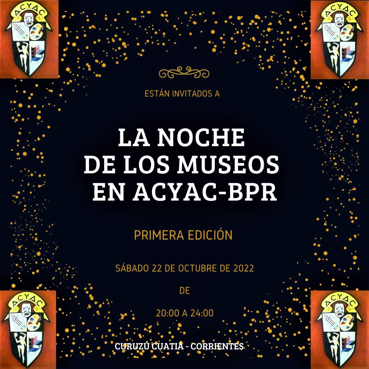 La Asociación Cultural y Artística Curuzucuatiense y la Biblioteca Popular Rivadavia, invitan a la comunidad a la primera edición de “LA NOCHE DE LOS MUSEOS”, será este sábado 22 de octubre de 20 a 00 horas en la Casa de la Cultura, Dr. Pozzi 560.