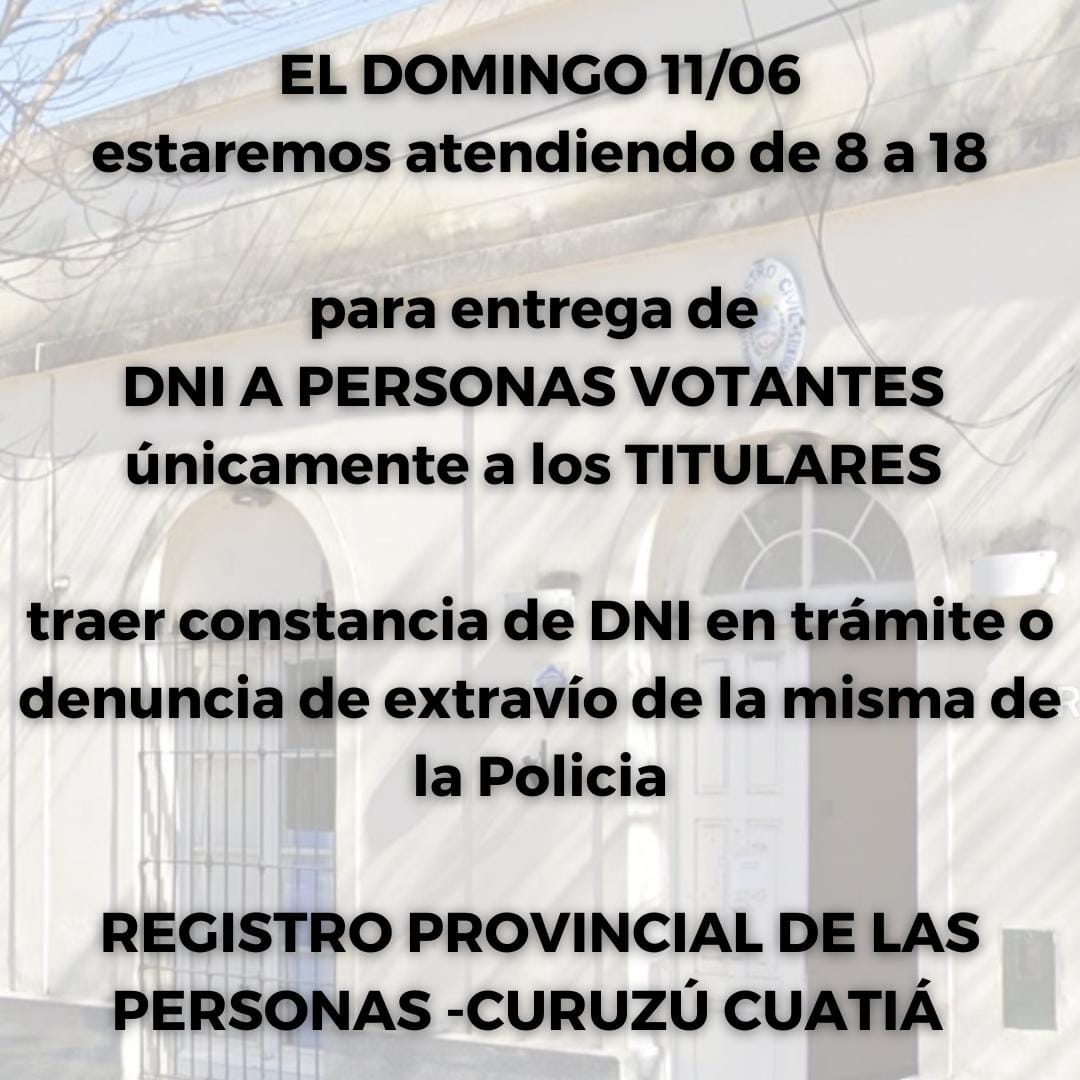 El Registro Civil de las Personas atenderá este domingo 11 de junio de 8 a 18 horas únicamente para retirar DNI de votantes. El trámite es personal del titular con la constancia correspondiente, así informó la Delgada Local Stella Maris Rodríguez