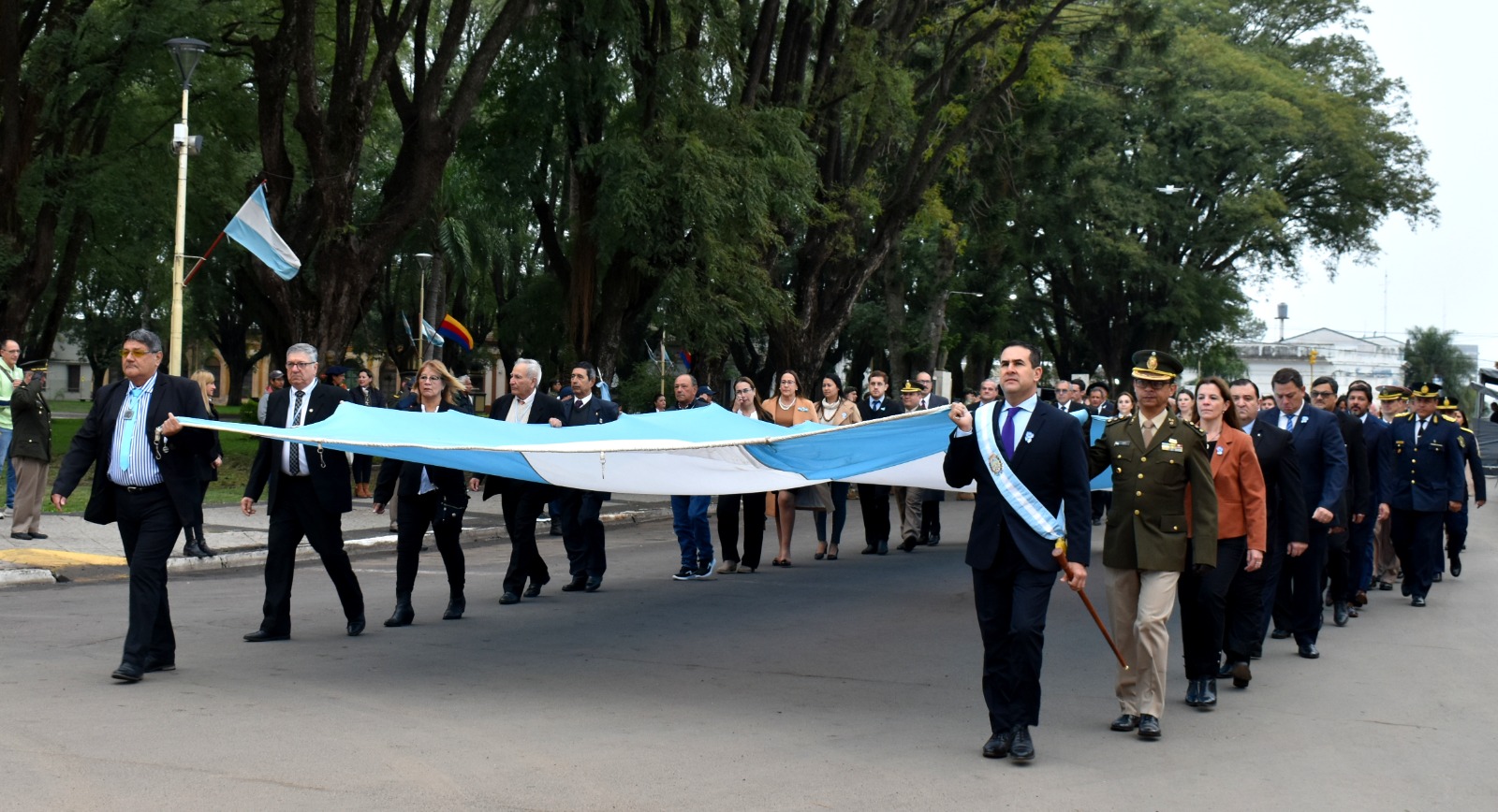 Cerca de las 9:00 horas, autoridades de la ciudad y ex combatientes de Malvinas trasladaron el Pabellón Nacional hasta el mástil mayor, donde fue izada al sonar de los acordes del Himno Nacional Argentino.