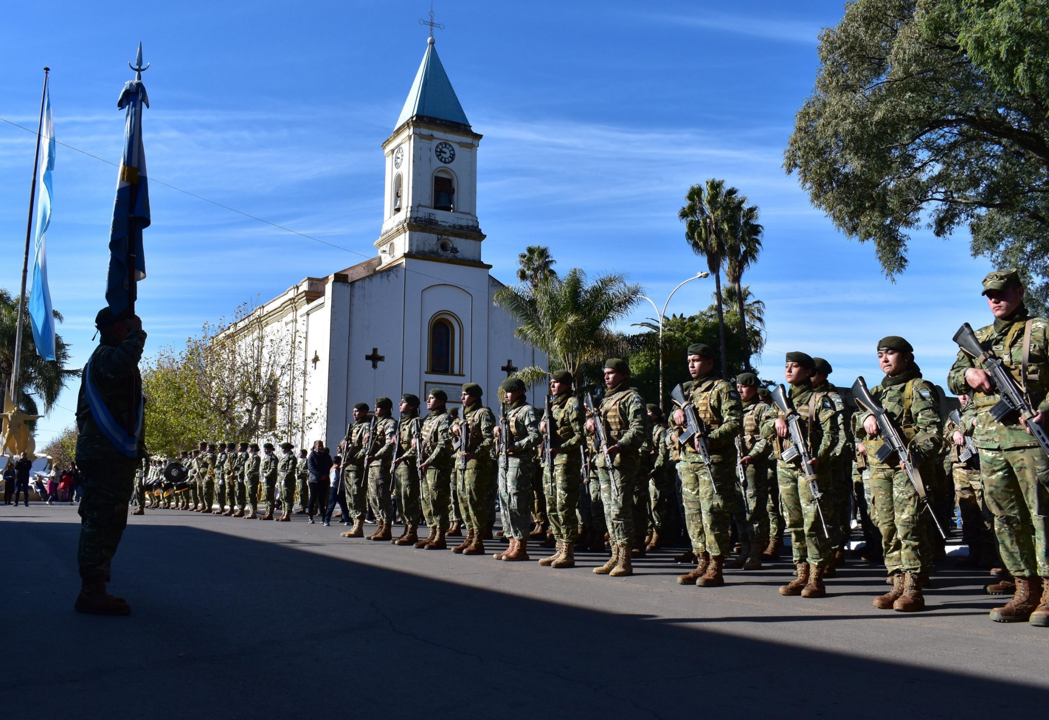 Luego las autoridades se trasladaron hasta el palco oficial frente al monumento del General Manuel Belgrano en la plaza que lleva su nombre para dar inicio al acto central con el saludo del general Aldo Ferrari y el vice intendente Morandini a la guarnición militar presente.