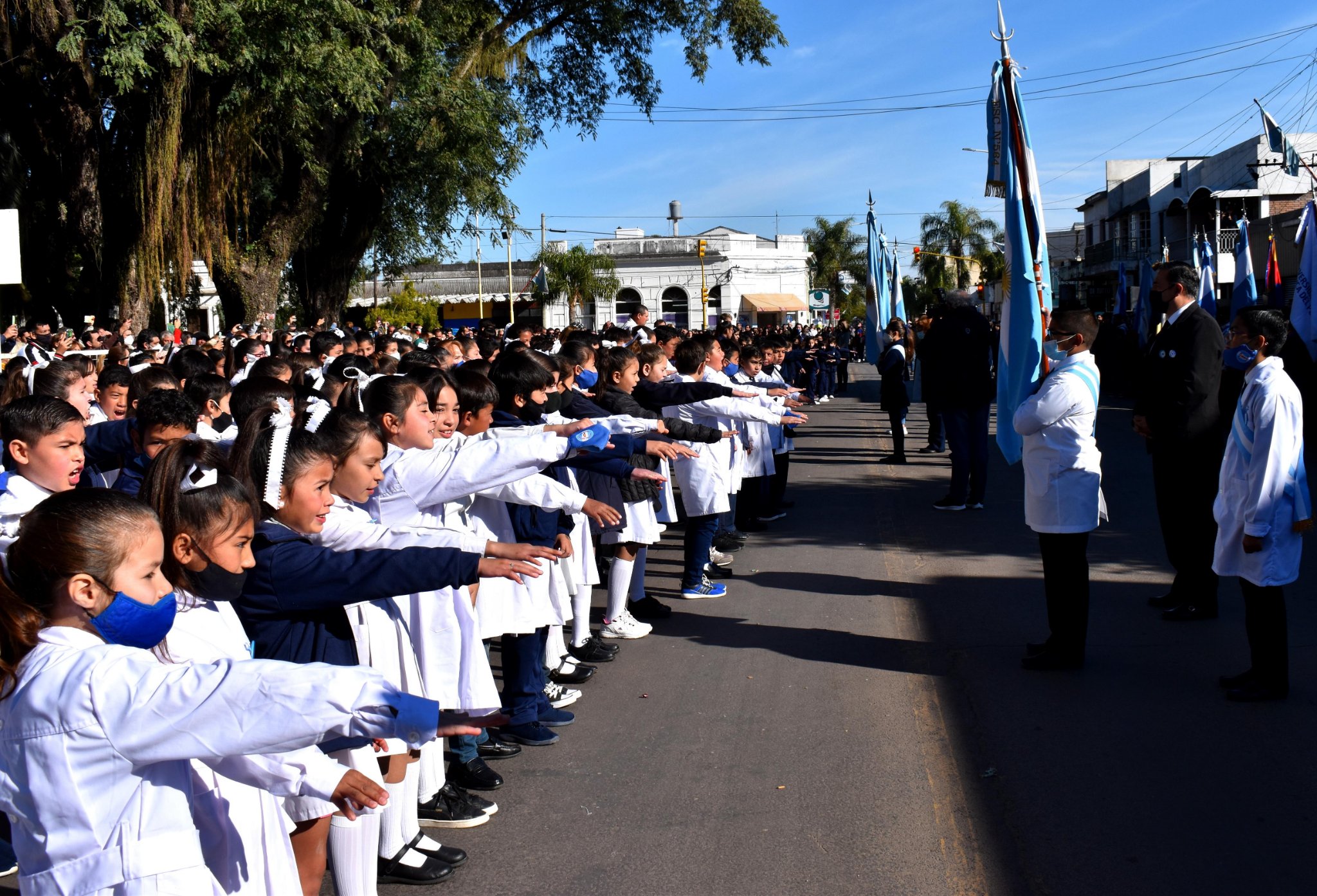 Uno de los momentos más emotivos del acto fue cuando los alumnos de cuarto grado de las escuelas primarias de Curuzú Cuatiá, más de mil alumnos, prometieron lealtad a la enseña Nacional, a cargo de la directora de la Escuela cabecera N° 32 Belgrano, Juana Ester Denczuck de Fernández.