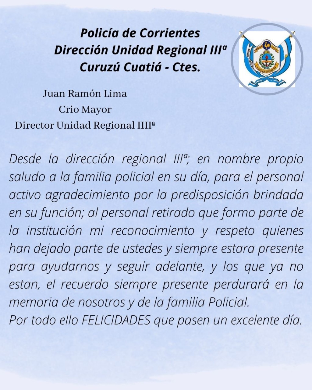 El Comisario Mayor Juan Ramón Lima envió a Enfoque Digital un comunicado al celebrarse este martes 8 de agosto el Día de la Policía de la Provincia de Corrientes.