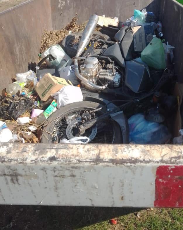 Una moto de 150 centímetros cúbicos, marca MOTOMEL, fue hallada abandonada en el interior de un volquete en horas de la mañana del domingo; así informaron a Enfoque Digital.