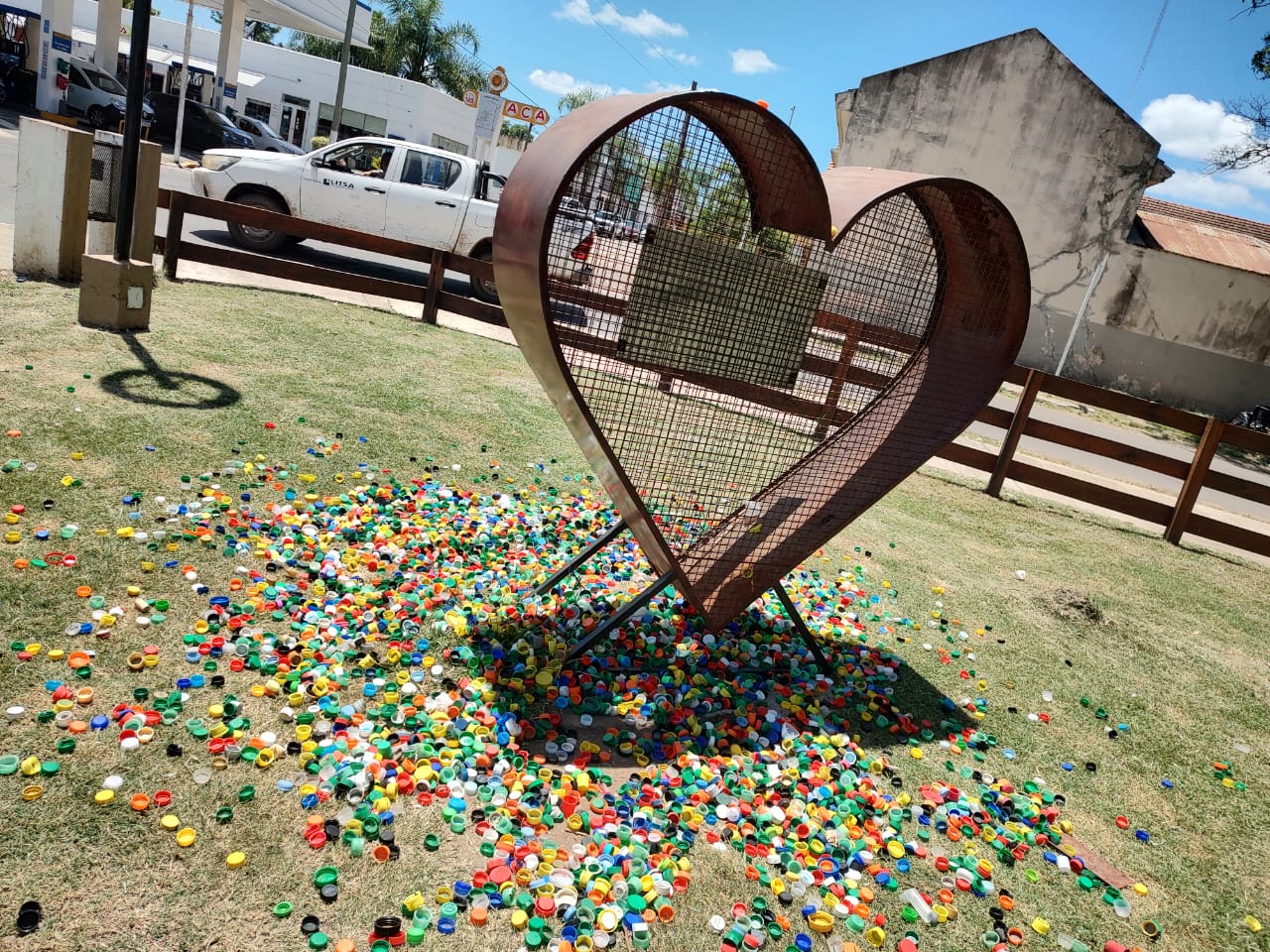 (25-01-2024) - Inescrupulosos causaron daño en la estructura con forma de corazón ubicada en Plazoleta Italia y desparramaron las tapitas plásticas que allí los vecinos depositan día a día.