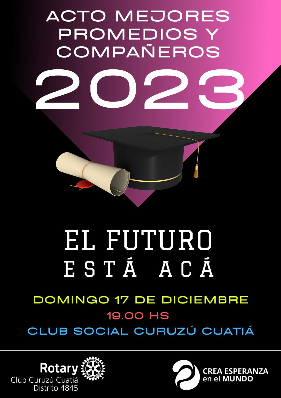 El Rotary Club Curuzú Cuatiá realizará la Ceremonia Anual de Premiación, donde honraremos a los Mejores Compañeros y a los Estudiantes con los Mejores Promedios de este año académico.
