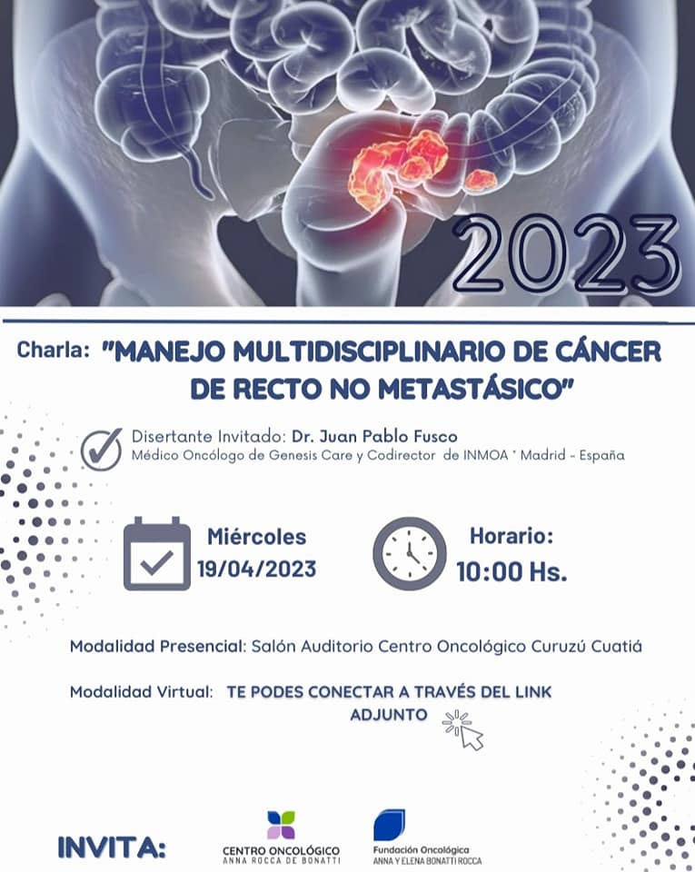 El próximo miércoles 19 de abril, a partir de las 10 de la mañana, en el Centro Oncológico de Curuzu Cuatiá se realizará una charla sobre “MANEJO MULTIDISCIPLINARIO DE CANCER DE RECTO NO METATASTICO”.
