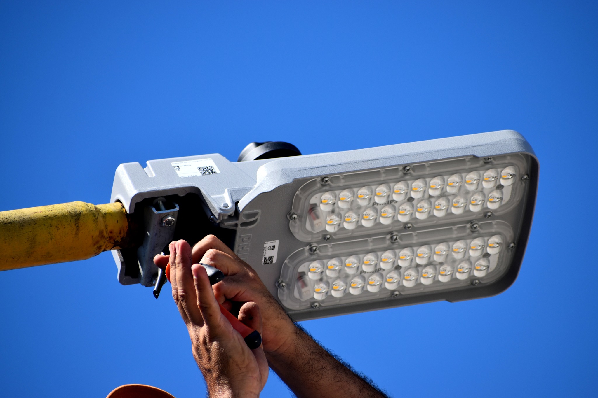 Personal del servicio de electrotecnia de la comuna llevan a cabo trabajos de reemplazo de luminarias convencionales por cabezales LED.
