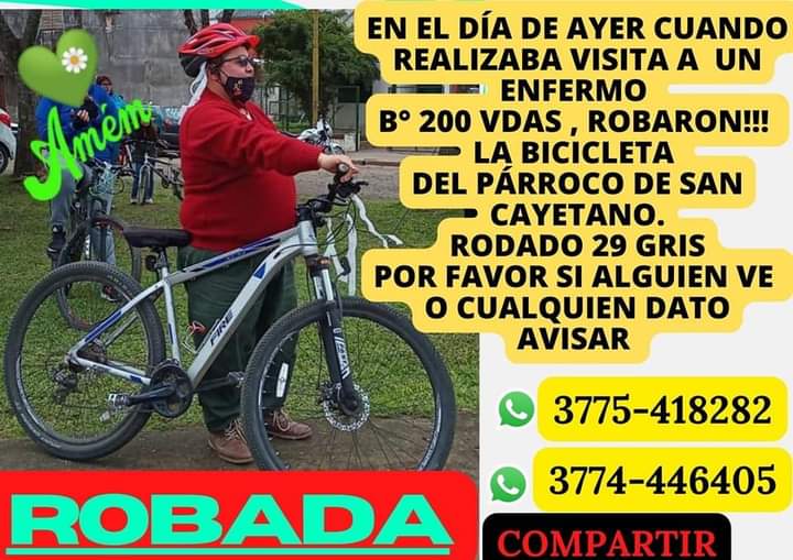 Desconocidos le robaron la bicicleta al Padre José Ortiz, Párroco de San Cayetano, cuando visitaba a un enfermo en horas de la noche del lunes.