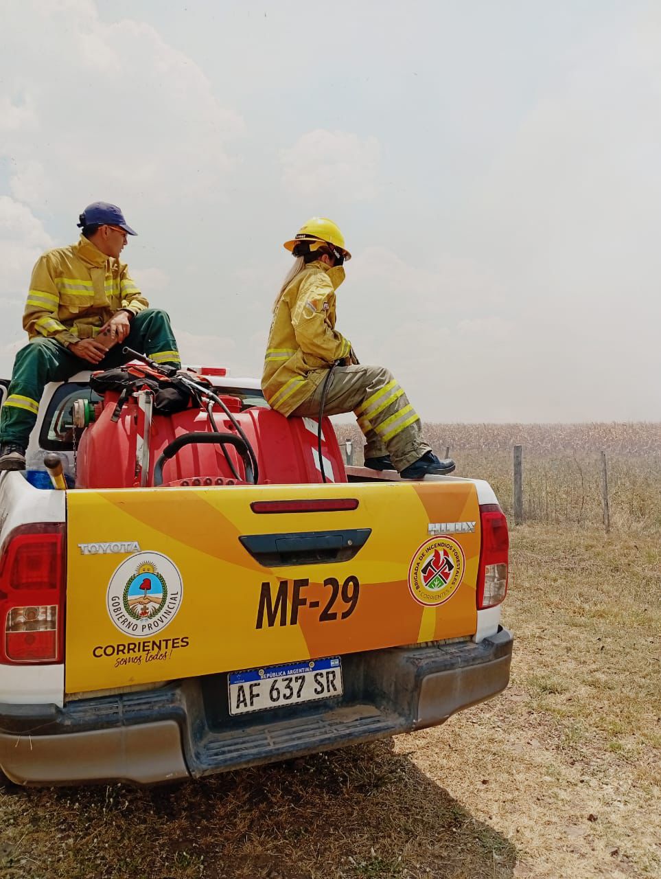 Brigadistas de la Policía de Corrientes y Bomberos Voluntarios trabajan arduamente para controlar los incendios en María Chica, Mariano I. Loza, Perugorría y Banquinas de Ruta Nacional 119.