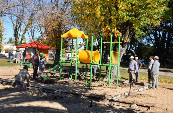 En la plaza General San Martín se están instalando un mangrullo de dos torres con 1 techo-toboganes cerrados pórtico y puente, más una calesita inclusiva apta para niños en silla de ruedas.