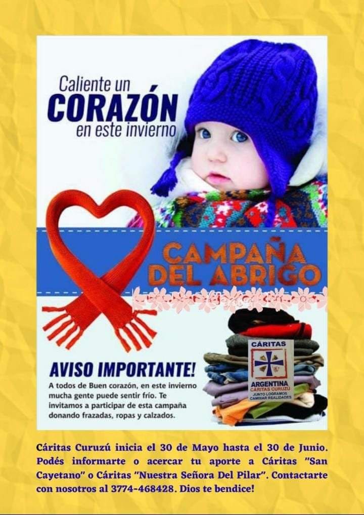Bajo el lema “Caliente un Corazón este este Invierno” CARITAS de Curuzu Cuatiá comenzó con una campaña para recolectar abrigos, frazadas, ropas y calzados; de la cruzada forman parte las sedes de la entidad ubicada en la Parroquia Nuestra Señora del Pilar y en la Parroquia San Cayetano, en ambos lugares pueden acercarse las donaciones o comunicarse al 3774-468428.