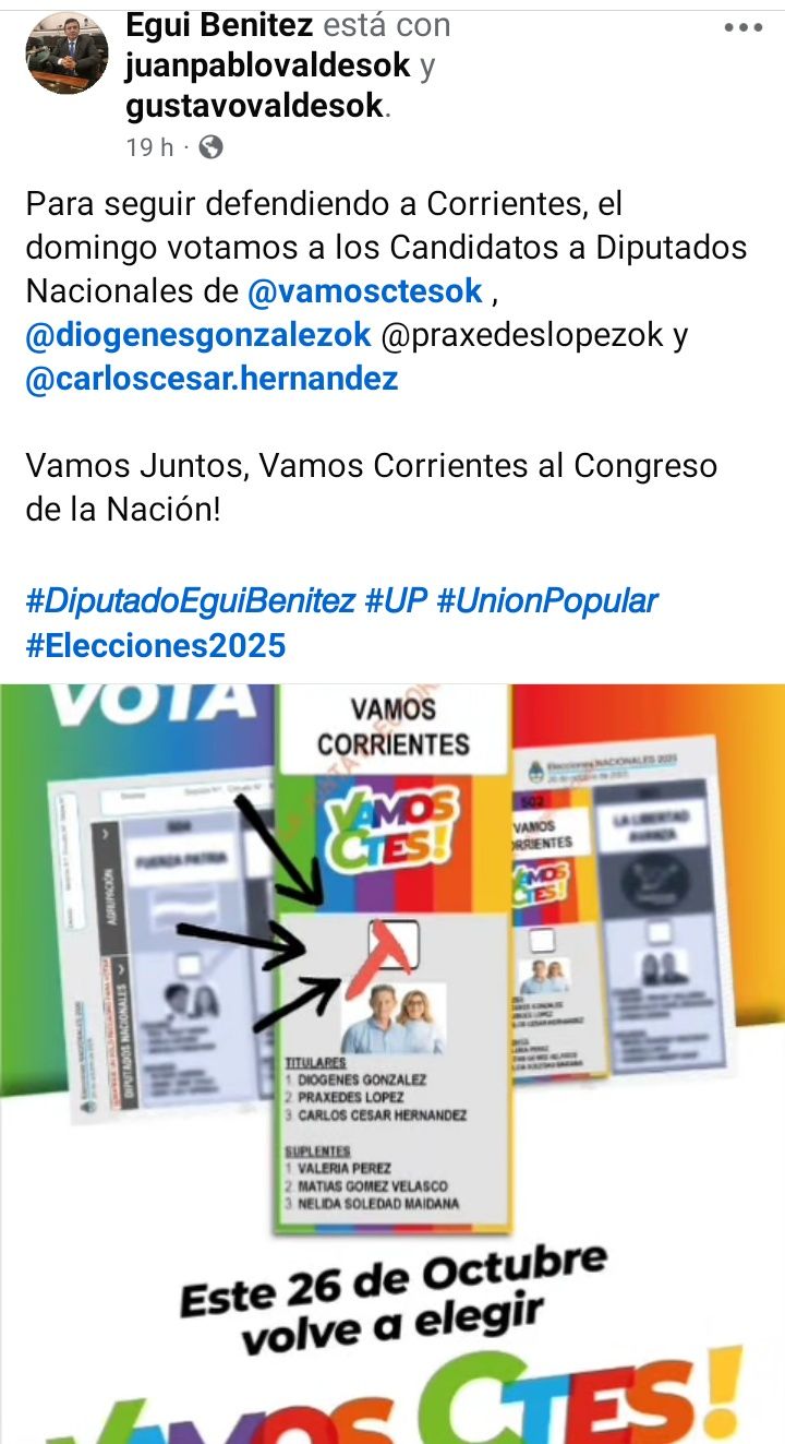 “Para seguir defendiendo a Corrientes, el domingo votamos a los Candidatos a Diputados Nacionales de Vamos Corrientes”, escribió el legislador curuzucuateño en su cuenta de Facebook, al expresar su claro apoyo a la lista confirmada por Diógenes González, Práxedes López y Carlos Cesar Hernández.