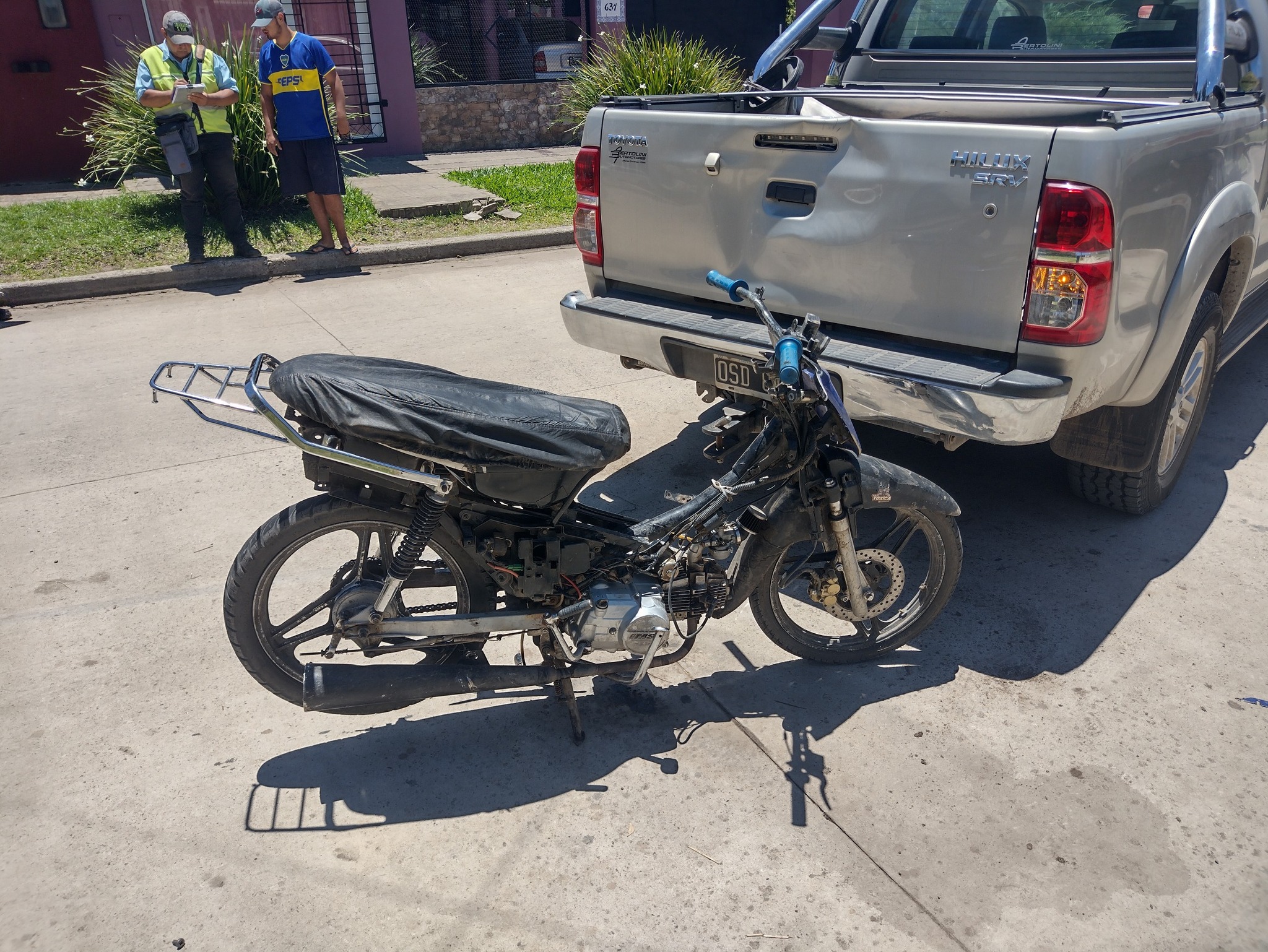 La camioneta, una Toyota Hilux, era conducida por un masculino de 46 años, quien salía de un domicilio con las luces indicatorias puestas, pero la moto, guiada por un joven de 17 años y que venía a una velocidad importante no logró frenar a tiempo para evitar el impacto.