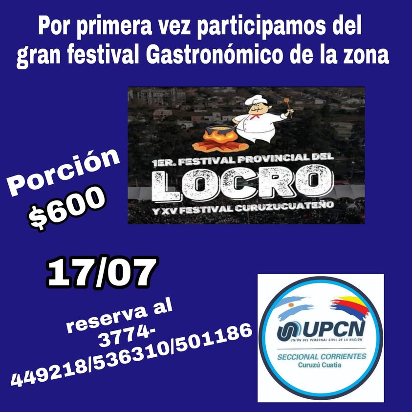 La delegación Curuzú Cuatiá UPCN participará del XV festival del locro, a entidad gremial viene realizado locro por tres años consecutivos todo los 1 de mayo para sus afiliados y en esta oportunidad decidieron ser parte de esta fiesta Gastronómica apoyando las habilidades culinarias de su afiliado Gustavo Romero quien es el cocinero.
