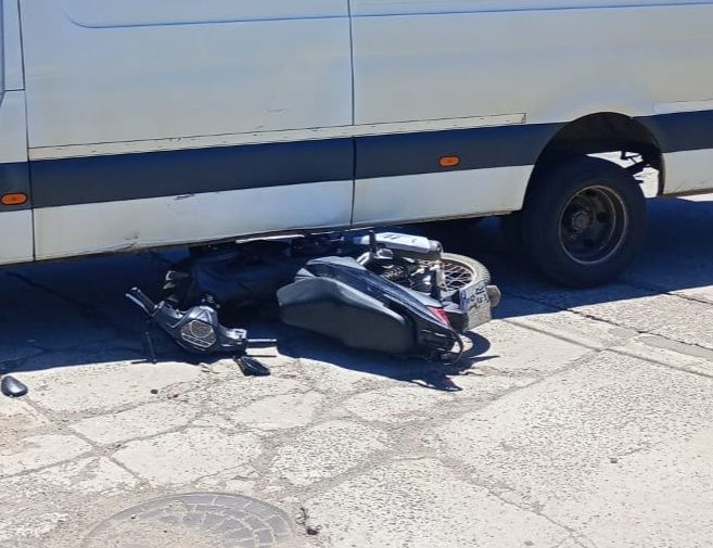 Una peligrosa maniobra de una combi al girar en U sobre Avenida del Bicentenario a la altura del 1500 por poco no termina en tragedia, ya que una moto de 110 centímetros cúbicos terminó debajo de la misma.